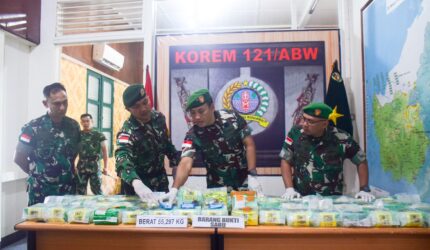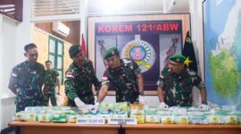 Korem 121/Abw melalui Satgas Pamtas RI-Malaysia Yonarhanud 1/Pbc Kostrad berhasil gagalkan upaya penyelundupan Narkotika jenis sabu seberat 55,297 Kilogram di perbatasan