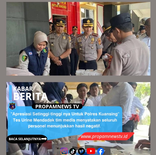 TELUK KUANTAN, // PropamNewstv.id โ Komitmen Kepolisian Resor (Polres) Kuantan Singingi (Kuansing) dalam memberantas peredaran narkoba di internal kepolisian bukan sekadar isapan jempol. Pada Senin (23/2/2026), Lobi Mapolres Kuansing menjadi saksi ketegasan pimpinan dalam menjaga integritas korps Bhayangkara melalui tes urine mendadak bagi seluruh personel.