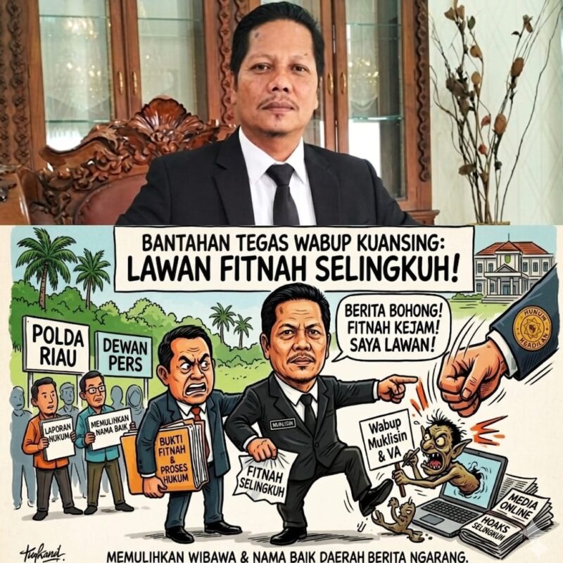 KUANSING,RIAU/PropamNewsTv.Idโ€“ Wakil Bupati Kuantan Singingi (Kuansing), Muklisin, membantah keras pemberitaan salah satu media online yang menuding dirinya terlibat dugaan perselingkuhan dengan perempuan berinisial VA. Menanggapi tuduhan tersebut, Muklisin menegaskan akan menempuh jalur hukum guna memulihkan nama baik pribadi maupun institusi.