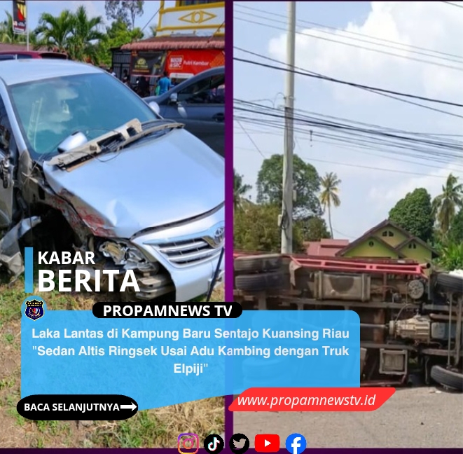 โKUANSING RIAU, // PropamNewstv.id โ Kecelakaan lalu lintas yang melibatkan satu unit mobil sedan Toyota Altis dan truk pengangkut gas LPG terjadi di Desa Kampung Baru, Kecamatan Sentajo Raya, Kabupaten Kuantan Singingi (Kuansing), Riau, pada Minggu (22/02/2026). Meski kedua kendaraan mengalami kerusakan berat, dipastikan tidak ada korban jiwa dalam insiden tersebut.