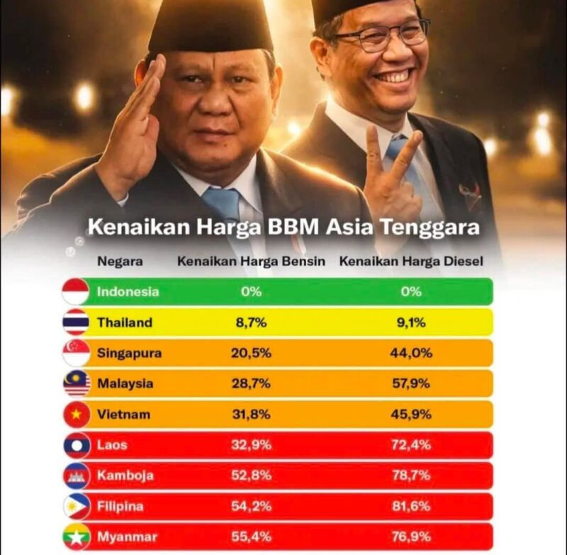 Berdasarkan data perbandingan regional, Indonesia berhasil mempertahankan angka kenaikan sebesar 0% untuk jenis bensin maupun diesel, jauh di bawah negara tetangga seperti Filipina dan Myanmar yang mengalami lonjakan hingga lebih dari 50%.
