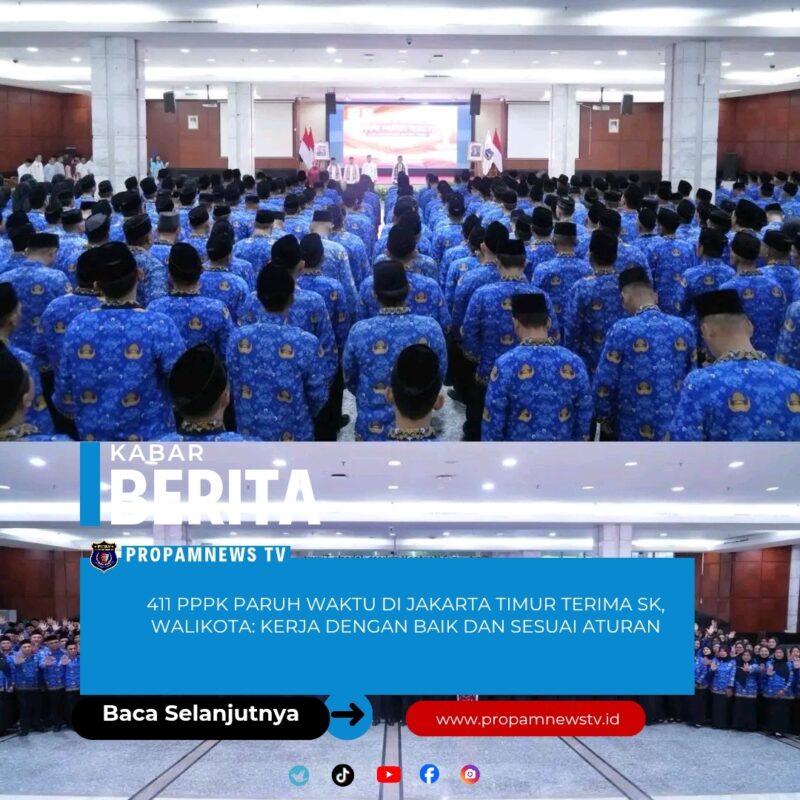 Jakarta // PropamNewstv.id – Pemerintah Kota Administrasi Jakarta Timur menyerahkan Surat Keputusan (SK) kepada 411 Pegawai Pemerintah dengan Perjanjian Kerja (PPPK) Paruh Waktu di Ruang Serbaguna Blok C, Kantor Walikota Jakarta Timur, Jumat (2/1/2026). Para PPPK Paruh Waktu tersebut merupakan pegawai yang akan bertugas di lingkungan Sekretariat Kota, kecamatan, dan kelurahan di wilayah Jakarta Timur.