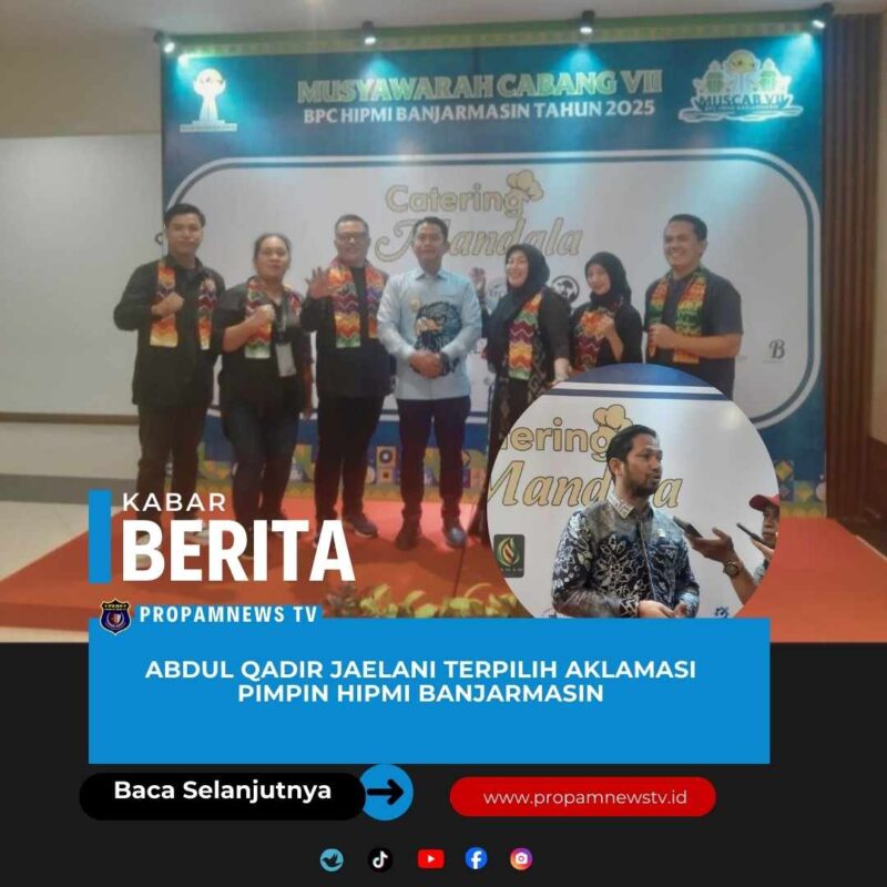 KALSEL // propamnewstv.id — Muscab VII HIPMI Banjarmasin resmi digelar, Abdul Qadir Jaelani terpilih sebagai Ketua Umum BPC HIPMI Kota Banjarmasin periode 2025-2028 melalui mekanisme aklamasi. Pelantikan kepengurusan baru ini menandai babak baru kepemimpinan HIPMI Banjarmasin.
