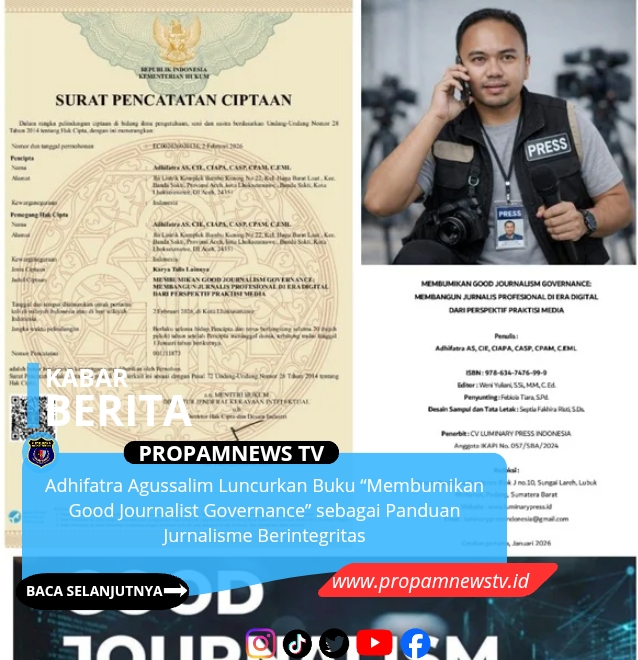 Aceh Utara, // PropamNewstv – Konsistensi dalam memperjuangkan kualitas informasi publik kembali ditunjukkan oleh Adhifatra Agussalim melalui penerbitan buku “Membumikan Good Journalist Governance”. Buku ini menjadi hasil dari perjalanan panjang penulis dalam mengamati, meneliti, dan terlibat langsung dalam dinamika dunia jurnalistik.