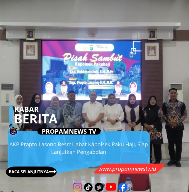 Tangerang, // PropamNewstv – Acara seremonial pisah sambut Kapolsek Paku Haji berlangsung khidmat di Gedung Serbaguna (GSG) Kecamatan Paku Haji, Selasa (24/2/2026). Jabatan Kapolsek Paku Haji resmi diserahterimakan dari AKP Rokhmatulloh, S.H., M.H. kepada AKP Prapto Lasono, S.H., M.H.