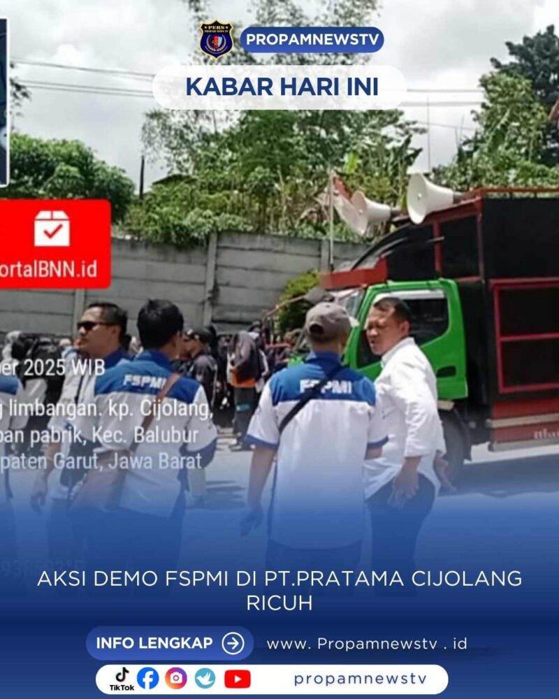 GARUT // propamnewstv.id – Aksi unjuk rasa yang digelar oleh Federasi Serikat Pekerja Metal Indonesia (FSPMI) di depan pabrik PT Pratama, Desa Cijolang, Kecamatan Balubur Limbangan, Kabupaten Garut, pada Rabu (03/12/2025) siang, berlangsung tegang dan sempat diwarnai kericuhan.