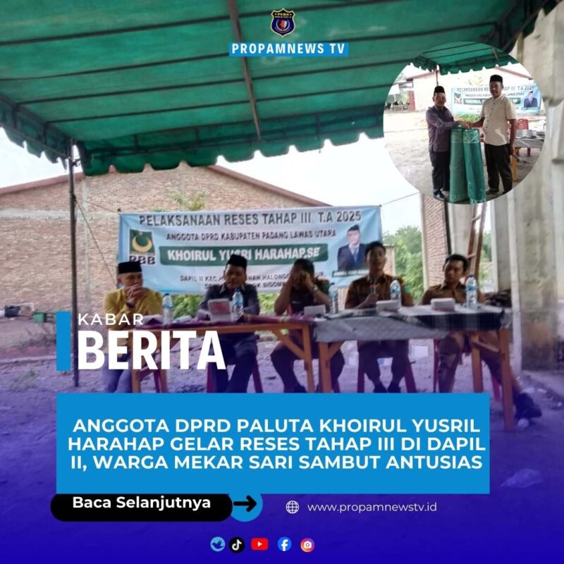 Padang Lawas Utara Sumut//propamnewstv.id— Anggota DPRD Kabupaten Padang Lawas Utara (Paluta), Khoirul Yusril Harahap, SE, melaksanakan Reses Tahap III Tahun Anggaran 2025 di Daerah Pemilihan (Dapil) II yang meliputi Kecamatan Halongonan, Halongonan Timur, Dolok, dan Dolok Sigompulon, pada Senin (15/12/2025).