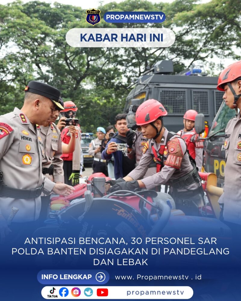 Serang//propamnewstv.id – Dalam rangka meningkatkan kesiapsiagaan menghadapi potensi bencana alam, sebanyak 30 personel Search and Rescue (SAR) Polda Banten disiagakan di dua titik rawan bencana, yaitu Polsek Labuan Polres Pandeglang dan Polsek Cipanas Polres Lebak. Kegiatan ini berlangsung selama 14 hari, terhitung mulai 3 Desember hingga 16 Desember 2025.
