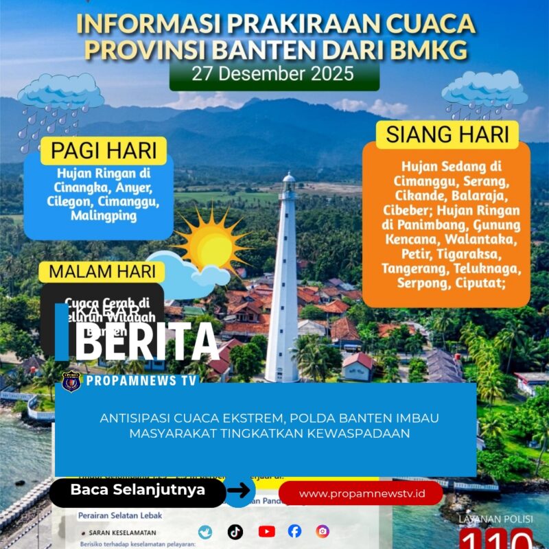 Serang //propamnewstv.id – Menyikapi prakiraan cuaca dari Badan Meteorologi, Klimatologi, dan Geofisika (BMKG) Banten, Polda Banten mengimbau masyarakat untuk meningkatkan kewaspadaan terhadap potensi cuaca ekstrem yang dapat terjadi di sejumlah wilayah Provinsi Banten pada Sabtu (27/12).
