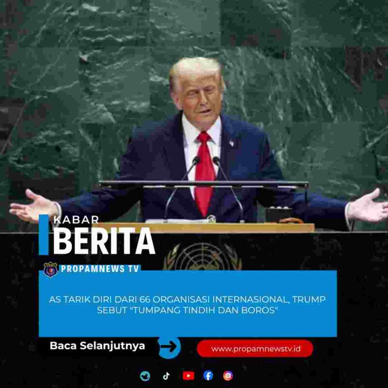 Amerika Serikat, // PropamNewstv.id – Presiden Amerika Serikat (AS) Donald Trump menandatangani perintah eksekutif pada Rabu (7/1) untuk menghentikan dukungan AS terhadap 66 organisasi, badan, dan komisi internasional, termasuk sejumlah lembaga di bawah Perserikatan Bangsa-Bangsa (PBB). Kebijakan ini menegaskan langkah AS semakin menjauh dari kerja sama global.