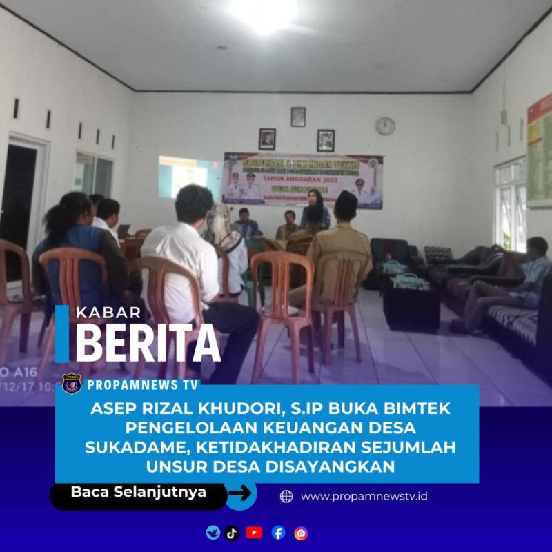Pandeglang // propamnewstv.id – Pemerintah Desa Sukadame, Kecamatan Pagelaran, Kabupaten Pandeglang, Banten, melaksanakan kegiatan Sosialisasi dan Bimbingan Teknis (Bimtek) Pengelolaan dan Penggunaan Keuangan Desa Tahun Anggaran 2025, Rabu (17/12/2025) pukul 10.00 WIB. Kegiatan tersebut berlangsung di Balai Desa Sukadame.