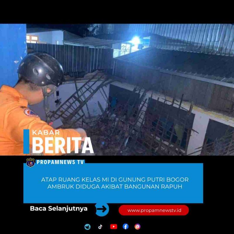 Jakarta, // PropamNewstv.id – Atap ruang kelas Madrasah Ibtidaiyah (MI) ambruk di Desa Cikeas Udik, Kecamatan Gunung Putri, Kabupaten Bogor. Atap ambruk diduga akibat kondisi bangunan sudah rapuh.