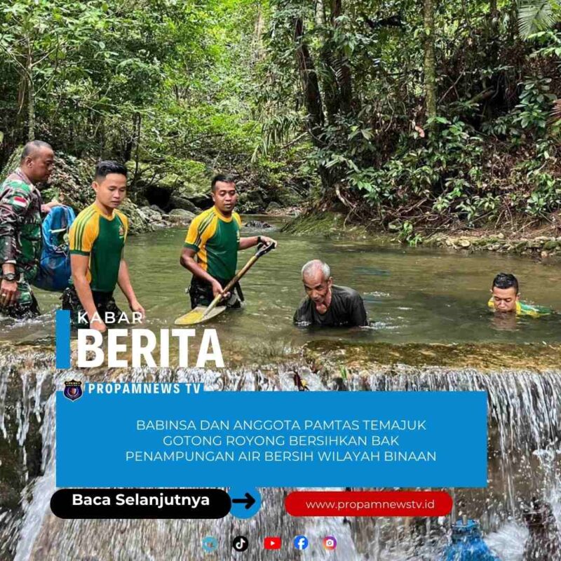TEMAJUK, SAMBAS, // PropamNewstv.id – Babinsa Desa Temajuk, Koramil 08/Paloh, Kodim 1208/Sambas Sertu Dwi Ariyanto melaksanakan kegiatan gotong royong bersama Anggota Pamtas dan warga membersihkan bak penampungan air bersih di wilayah binaannya, Rabu (14/01/26).