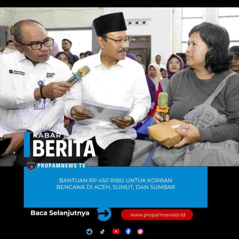 Jakarta, // PropamNewstv.id – Menteri Sosial, Saifullah Yusuf (Gus Ipul), menuturkan pihaknya menyalurkan bantuan tambahan sebesar Rp 450 ribu per orang untuk korban bencana banjir bandang dan longsor di Aceh, Sumatera Utara dan Sumatera Barat.