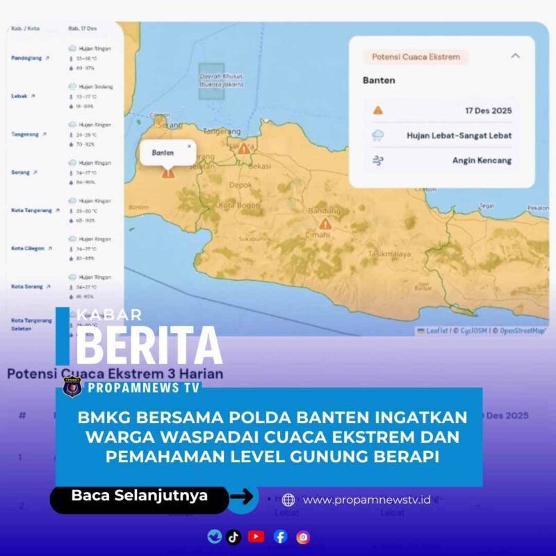 Serang // propamnewstv.id – Polda Banten kembali mengimbau masyarakat untuk meningkatkan kewaspadaan terhadap potensi cuaca ekstrem berdasarkan pembaruan informasi dari Badan Meteorologi, Klimatologi, dan Geofisika (BMKG) per Rabu (17/12). BMKG memprakirakan sebagian besar wilayah Provinsi Banten berpotensi mengalami hujan dengan intensitas ringan hingga sedang.