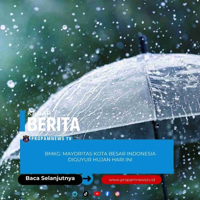 Jakarta, // PropamNewstv.id – Badan Meteorologi, Klimatologi, dan Geofisika (BMKG) memprakirakan mayoritas kota besar di Indonesia akan diguyur hujan dengan intensitas ringan hingga sedang pada Selasa, 13 Januari 2026. Masyarakat di wilayah timur dan tengah Indonesia diminta waspada terhadap potensi hujan lebat yang disertai kilat atau petir.