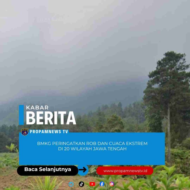 Semarang, // PropamNewstv.id – Cuaca ekstrem masih berpotensi terjadi di 20 daerah di Jawa Tengah, pada Selasa, 20 Januari 2026, yang membawa dampak bencana hindrometeorologi. Selain itu, masyarakat pesisir diminta waspada air laut pasang (rob) di perairan utara dan gelombang tinggi hingga 4 meter di perairan selatan Jawa Tengah.