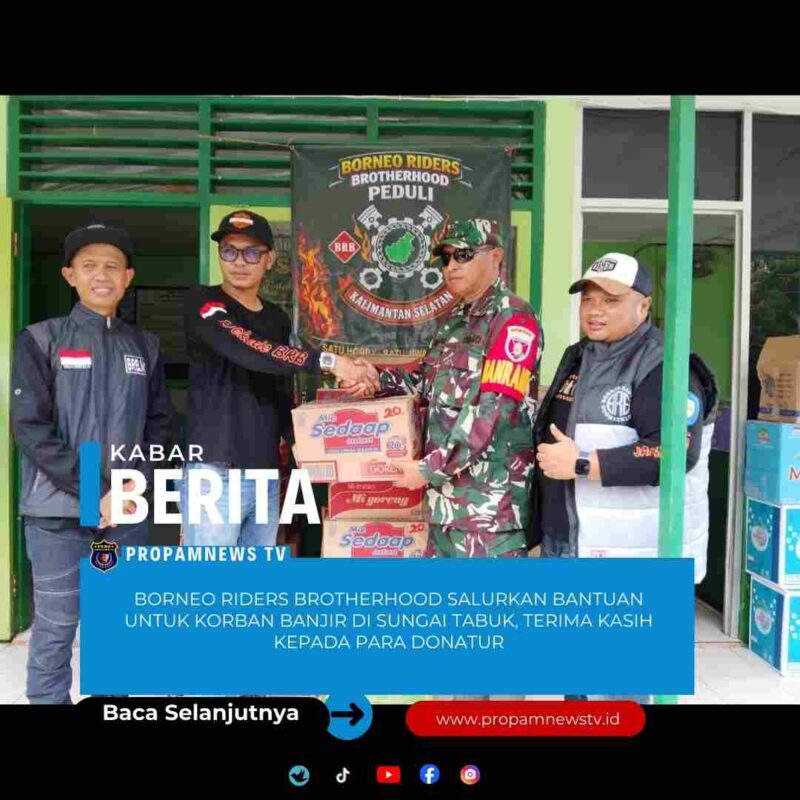 Sungai Tabuk, Kalimantan Selatan // PropamNewstv.id – Borneo Riders Brotherhood (BRB) menyerahkan bantuan untuk masyarakat yang terkena dampak banjir di Sungai Tabuk, pada Minggu, 4 Januari 2026. Bantuan ini diserahkan oleh H. Bobby Surya Dinata, mewakili BRB, kepada Koramil 1006 dan warga setempat.