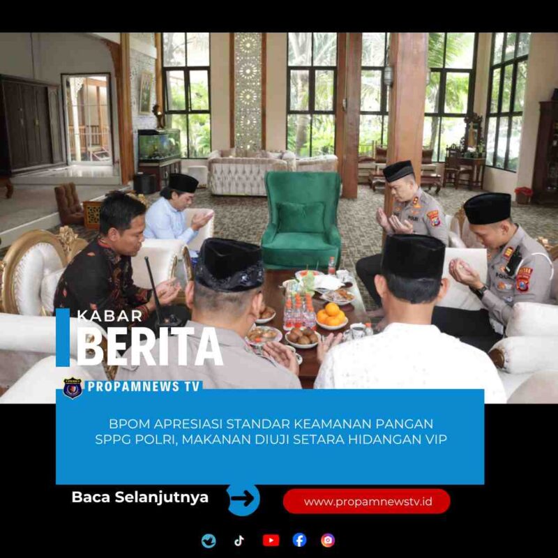 Jakarta //propamnewstv.id  — Kepala Badan Pengawas Obat dan Makanan (BPOM) Republik Indonesia, Prof. dr. Taruna Ikrar, M.Biomed., Ph.D., memberikan apresiasi tinggi terhadap penerapan standar keamanan pangan di Satuan Pelayanan Pemenuhan Gizi (SPPG) Polri. Hal tersebut disampaikan saat melakukan kunjungan dan pengecekan langsung terhadap proses pengolahan makanan bergizi gratis yang disiapkan di dapur SPPG Polri Cipinang.