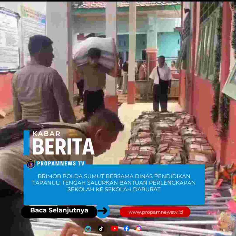 Tapanuli Tengah, // PropamNewstv.id — Kepedulian Polri terhadap dunia pendidikan kembali ditunjukkan melalui aksi kemanusiaan pascabencana alam. Personel SAR Satuan Brimob Polda Sumatra Utara Batalyon A bersinergi dengan Dinas Pendidikan Kabupaten Tapanuli Tengah menyalurkan bantuan perlengkapan sekolah kepada sejumlah sekolah darurat di Kecamatan Tukka, Kabupaten Tapanuli Tengah, Rabu (7/1/2026).