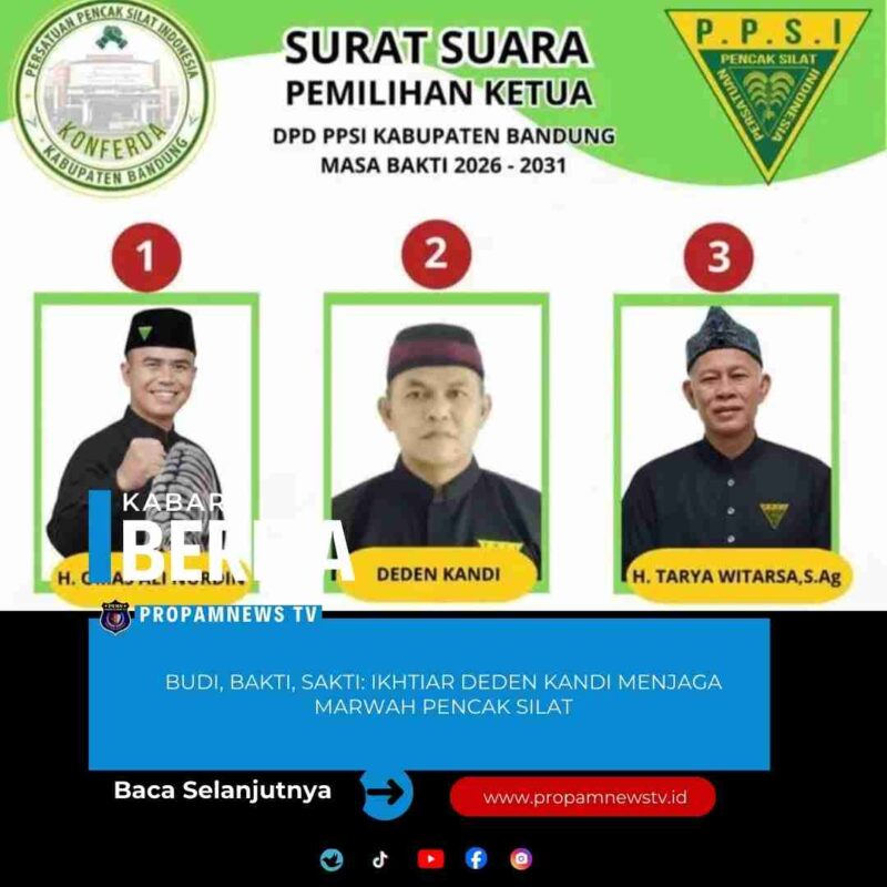 Dengan mengusung semboyan Budi, Bakti, Sakti, Deden Kandi secara resmi menyatakan maju sebagai Bakal Calon Ketua Dewan Pimpinan Daerah (DPD) PPSI Kabupaten Bandung untuk masa bakti 2026–2031. Langkah ini menjadi ikhtiar menjaga marwah pencak silat agar tetap berdiri tegak sebagai warisan leluhur, hidup di masa kini, dan berakar kuat bagi generasi mendatang.