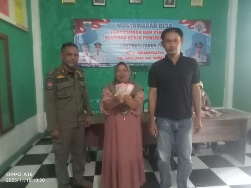 Pandeglang, Banten//propamnewstv.id — Masyarakat Desa Harapankarya, Kecamatan Pagelaran, Kabupaten Pandeglang, tampak bahagia menyambut pencairan bantuan Program Keluarga Harapan (PKH) yang dilaksanakan di Kantor Desa Harapankarya, Senin (10/11/2025).