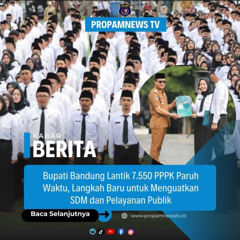 Bandung, 8 Desember 2025 // propamnewstv.id — Udara pagi di Lapangan Upakarti, Soreang, terasa berbeda. Ribuan wajah penuh harap memenuhi area pelantikan, menyimak setiap kata yang disampaikan Bupati Bandung Dadang Supriatna. Di bawah langit yang cerah itu, sebanyak 7.550 PPPK Paruh Waktu resmi dilantik—menandai babak baru perjalanan pelayanan publik di Kabupaten Bandung.