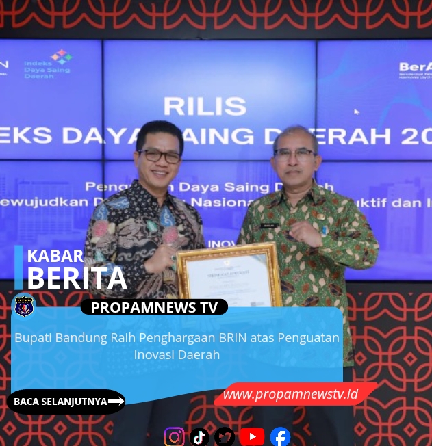 JAKARTA, // PropamNewstv.id — Bupati Bandung Dadang Supriatna kembali meraih penghargaan tingkat nasional setelah menerima Sertifikat Apresiasi dari Badan Riset dan Inovasi Nasional (BRIN) atas keberhasilan memperkuat inovasi dan daya saing daerah.