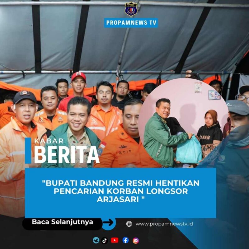 KAB. BANDUNG // propamnewstv.id – Bupati Bandung Dadang Supriatna resmi menghentikan pencarian tiga korban longsor di Kampung Condong RT 06-07/RW 09 Desa Wargaluyu Kecamatan Arjasari Kabupaten Bandung, Kamis (11/12/2025) sore.