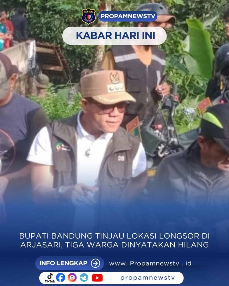 Kab Bandung // propamnewstv.id — Bupati Bandung Dadang Supriatna meninjau langsung lokasi bencana longsor di Kampung Condong, Desa Wargaluyu, Kecamatan Arjasari, Kabupaten Bandung, yang terjadi pada hari Jumat (5/12/2025) sore. Longsor tersebut mengakibatkan tiga warga tertimbun material dan dua rumah rusak berat.