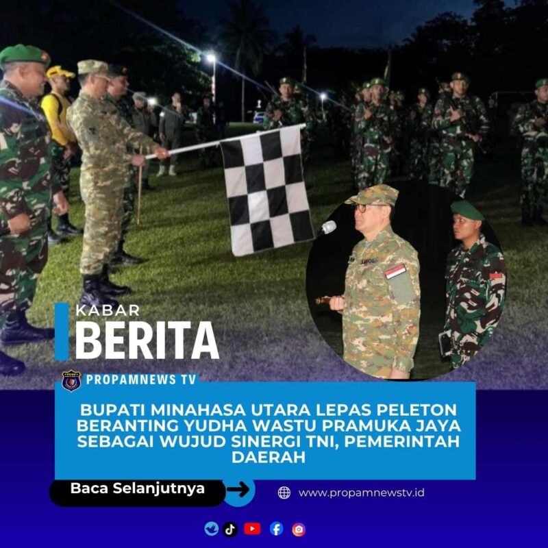 MINAHASA UTARA // propamnewstv.id – Bupati Minahasa Utara Joune J. E. Ganda, S.E.,MAP., M.M., M.Si., memimpin upacara serah terima simbol gerak jalan Peleton Beranting Yudha Wastu Pramuka Jaya (YWPJ) Tahun 2025 yang bertempat di Lapangan Bola Kompi C Yonzipur 19/YKN Kel. Sukur Kec. Airmadidi Kabupaten Minahasa Utara sekitar Pukul 04.05 WITA. Kamis, ( 18/12/2025 ).
