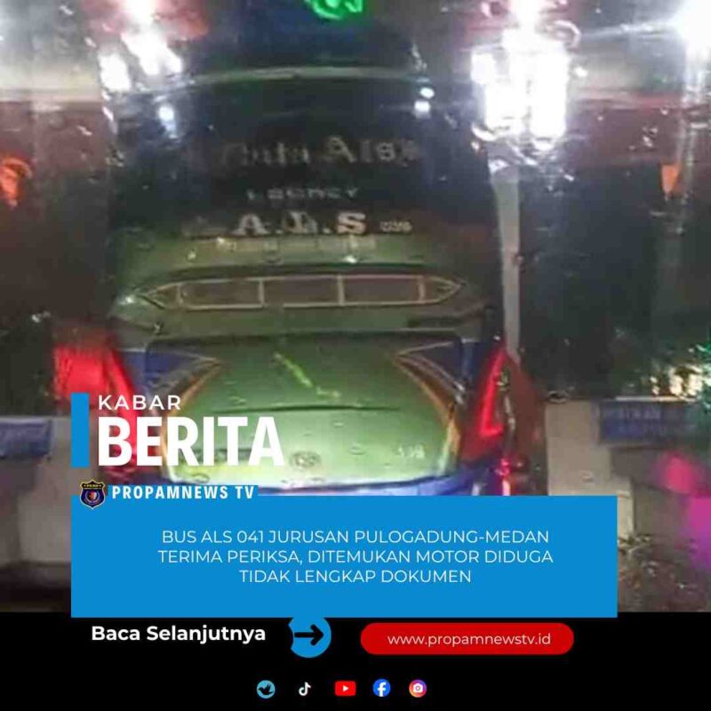 Serang Banten //propamnewstv.id – Armada Bus ALS dengan nomor identifikasi 041 yang sedang melayani rute Pulogadung–Medan harus menerima pemeriksaan dari Tim Reserse Mobil (Resmob) Polda Banten pada Senin malam. Dalam pemeriksaan tersebut, petugas menemukan beberapa unit sepeda motor yang diduga tidak memiliki surat-surat resmi lengkap, yang akan melalui jalur pelabuhan Merak–Bakauheni untuk menuju Pulau Sumatra.