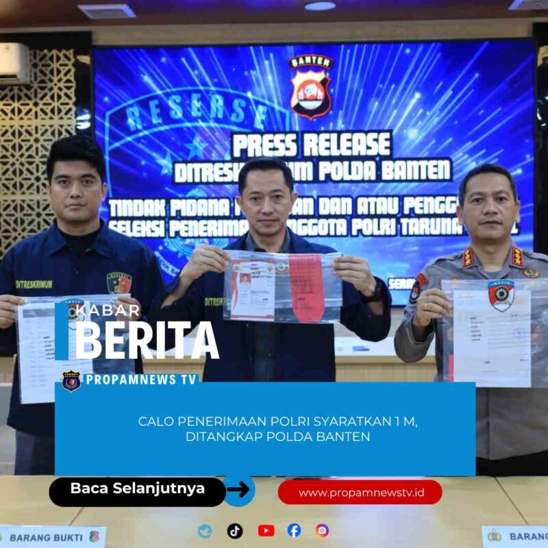 Serang //propamnewstv.id – Direktorat Reserse Kriminal Umum (Ditreskrimum) Polda Banten berhasil mengungkap kasus tindak pidana penipuan dan/atau penggelapan dengan modus menjanjikan kelulusan seleksi penerimaan Calon Taruna Akademi Kepolisian (AKPOL). Dalam pengungkapan tersebut, penyidik menetapkan satu orang tersangka berinisial NR (54) alias Abah Jempol, warga Kecamatan Kasemen, Kota Serang.
