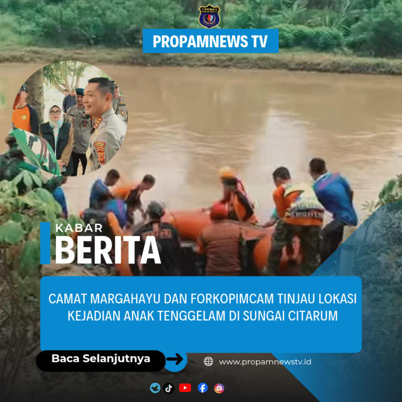 Margahayu, 9 Desember 2025//propamnewstv.id— Pagi itu suasana di bantaran Sungai Citarum tampak hening namun sarat harapan. Petugas SAR, relawan, dan unsur aparat berdiri menyisir aliran sungai, menatap setiap sudut permukaan air dengan penuh kehati-hatian. Di tengah suasana yang berat itu, Camat Margahayu, Hj. Tatti Suharyati, S.H., M.Si, bersama jajaran Forkopimcam Margahayu, hadir mendampingi Kapolresta Bandung dalam peninjauan hari kedua upaya pencarian anak yang dilaporkan tenggelam.