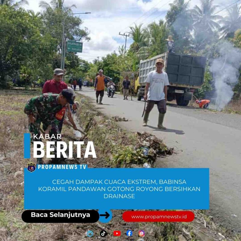 BARABAI, // PropamNewstv.id – Sebagai upaya mengantisipasi dampak cuaca ekstrem dan potensi terjadinya banjir, Babinsa Koramil 1002-05/Pandawan Sertu Sugianto bersama masyarakat melaksanakan kegiatan pembersihan drainase di Desa Banua Asam, Kecamatan Pandawan, Kabupaten Hulu Sungai Tengah, Kamis (15/01/2026).