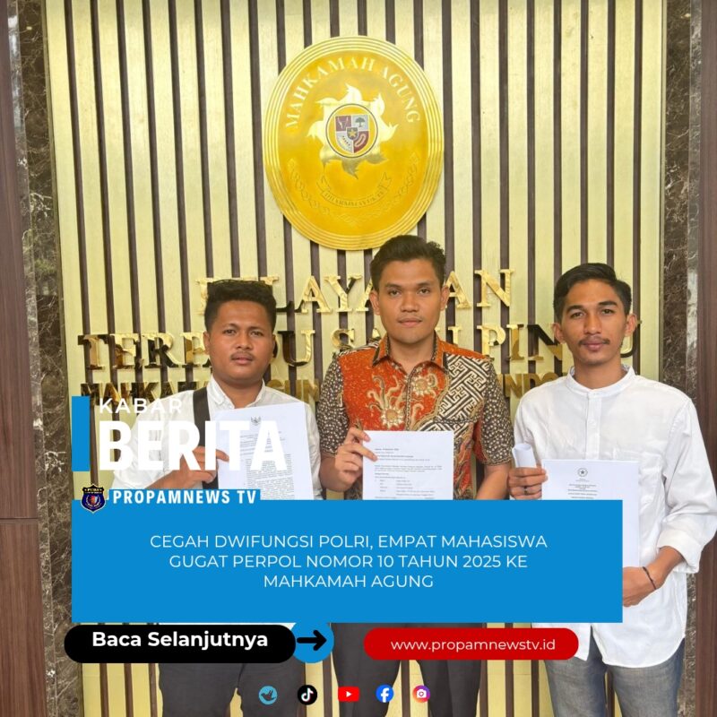 JAKARTA //propamnewstv.id – Empat warga negara Indonesia yang berlatar belakang sebagai mahasiswa hukum resmi mendaftarkan permohonan hak uji materiil (HUM) ke Mahkamah Agung (MA) dengan nomor pendaftaran APP-2025-000055. Gugatan ini diajukan untuk menguji secara materiil Peraturan Kepolisian Negara Republik Indonesia (Perpol) Nomor 10 Tahun 2025 yang mengatur tentang penugasan anggota Polri di luar struktur organisasi kepolisian.  Para Pemohon, yakni Abdul Fattah, SH, Al Taufik Al Falah, Akhsanul Kholiqin, SH, dan M. Afif Amanullah, SH, mengajukan permohonan ini pada 20 Desember 2025 terhadap Kepolisian Republik Indonesia selaku Termohon.