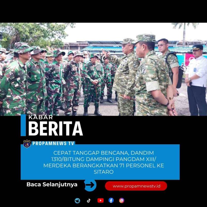 Sebanyak 71 Orang Personel TNI AD dari Satuan jajaran Kodam XIII/Mdk, dikerahkan untuk membantu korban bencana banjir bandang. Apel pengecekan dan pemberangkatan pengerahan personel perbantuan penanggulangan bencana alam banjir bandang di Kecamatan Siau Barat Kab. Sitaro, dipimpin langsung oleh Pangdam XIII/Mdk, Mayjen TNI Mirsa Agus, S.I.P.
