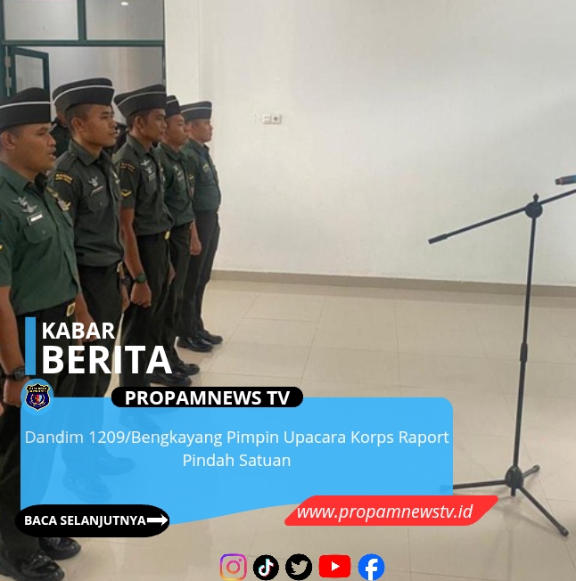 BENGKAYANG, // PropamNewstv.id – Komandan Kodim 1209/Bky, Letkol Inf Aprianda, S.H., M.Sc., memimpin langsung upacara Korps Raport Pindah Satuan. Acara ini merupakan tradisi satuan yang bertujuan untuk memberikan penghormatan dan penghargaan kepada prajurit yang akan melanjutkan pengabdian di tempat tugas yang baru, sekaligus menjaga silaturahmi antar prajurit, yang bertempat di Aula Makodim Jl. Raya Bengkayang–Sanggau Ledo Ds. Magmagan Karya Kec. Lumar Kab. Bengkayang.