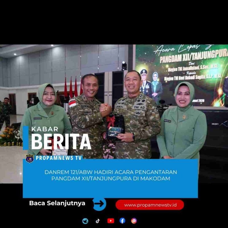 PONTIANAK, // PropamNewstv.id – Danrem 121/Abw Brigjen TNI Purnomosidi, S.I.P., M.A.P., M.Han., bersama Ketua Koorcab Rem 121 PD XII/Tanjungpura, Ny. Debby Purnomosidi, hadiri acara pengantaran Pangdam XII/Tanjungpura Mayjen TNI Jamallulael, S.Sos., M.Si. Kegiatan tersebut berlangsung khidmat, bertempat di Markas Komando Daerah Militer (Makodam) XII/Tanjungpura, Sabtu (17/01/2026).
