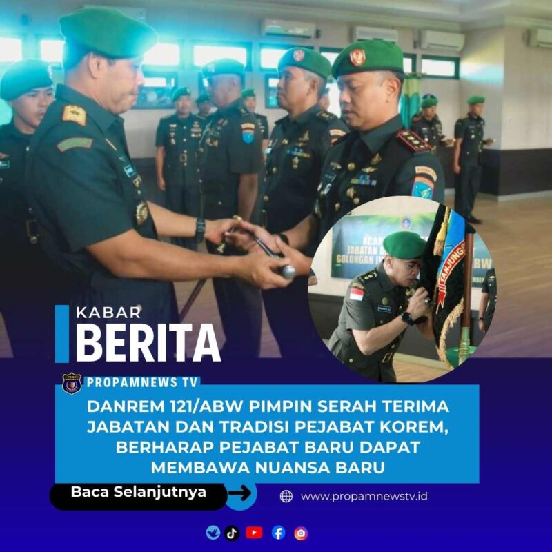 SINGKAWANG // propamnewstv.id – Danrem 121/Abw Brigjen TNI Purnomosidi, S.I.P., M.A.P., M.Han., pimpin acara Serah Terima Jabatan dan Tradisi Pejabat Korem 121/Abw, bertempat di Aula Kodim 1202/Singkawang, Kalimantan Barat, Kamis (18/12/2025).