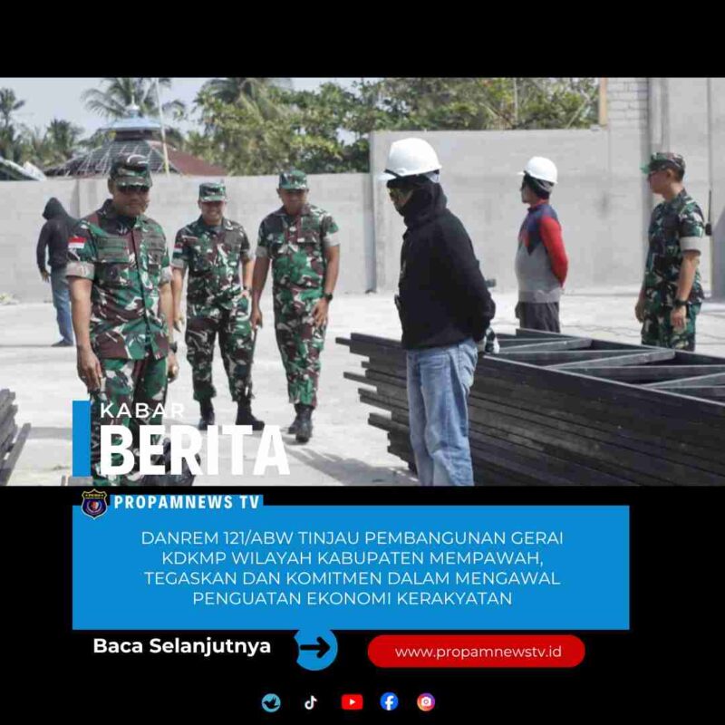 MEMPAWAH, // PropamNewstv.id – Danrem 121/Abw Brigjen TNI Purnomosidi, S.I.P., M.A.P., M.Han., didampingi Kasiter Kasrem 121/Abw Kolonel Inf Neggy Kuntagina, Kasiintel Kasrem 121/Abw Kolonel Inf Alim Mustofa dan Dandim 1201/Mempawah Letkol Czi Ali Isnaini, S.E., M.Han., meninjau pembangunan Gerai KDKMP (Koperasi Desa/Kelurahan Merah Putih) di wilayah Kodim 1201/Mempawah, Rabu (21/1/2026).