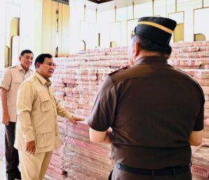 JAKARTA // propamnewstv.id – Presiden Prabowo Subianto menyaksikan secara langsung penyerahan uang pengganti kerugian negara sebesar Rp13,25 triliun dalam perkara tindak pidana korupsi pemberian fasilitas ekspor crude palm oil (CPO) dan turunannya, di Gedung Utama Kompleks Kejaksaan Agung RI, Jakarta, Senin (20/10/2025).