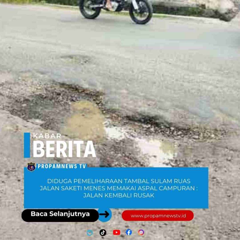 Pandeglang, // PropamNewstv.id – Pemeliharaan ruas jalan Saketi Menes yang sedang berlangsung sudah satu minggu ini menuai kontroversi pasalnya pemeliharaan ini sudah di tambal sulam pada malam hari namun pemelihraan tersebut di nilai tidak maksimal dan asal jadi diduga kuat memakai aspal campuran bukan 100% aspal murni. Kamis 15/01/2026