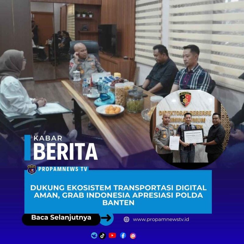 Serang // propamnewstv.id – Kepolisian Daerah (Polda) Banten menerima Apresiasi dari PT. Grab Teknologi Indonesia (Grab Indonesia) atas kolaborasi dan komitmen dalam upaya penegakan hukum guna menjaga keamanan dan ketertiban masyarakat di wilayah hukum Polda Banten atas keberhasilan pengungkapan kasus pembunuhan driver grab.