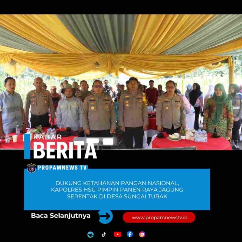 AMUNTAI UTARA, // PropamNewstv.id – Dalam upaya menyukseskan program swasembada pangan pemerintah, Polres HSU menggelar kegiatan Panen Raya Jagung Serentak Quartal IV Tahun 2025. Kegiatan ini dipusatkan di Desa Sungai Turak, Kecamatan Amuntai Utara, Kabupaten Hulu Sungai Utara (HSU) pada Kamis siang (08/01/2026).