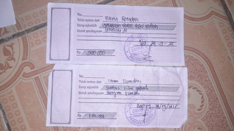 Iman romdoni kelas 10 yang ingin melakukan perpindahan sekolah dirinya ingin meminta surat pindah kepada guru namun dirinya di haruskan melunasi seragam sekolah dengan harga 1.000.000 juta rupiah dengan memakai Kwitansi. ucap Encum Sumarni Selaku orang tua sabtu,29/11/2025.