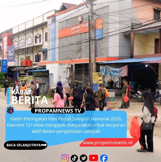 Sintang, // PropamNewstv.id – Danrem 121/Abw Brigjen TNI Purnomosidi, S.I.P., M.A.P., M.Han., bersama para pejabat Korem 121/Abw menghadiri Peringatan Hari Peduli Sampah Nasional Tahun 2026. Kegiatan di awali dengan apel bertempat di Halaman Belakang Masjid Al-Amin Sintang, Kalimantan Barat, Sabtu (21/02/2026).