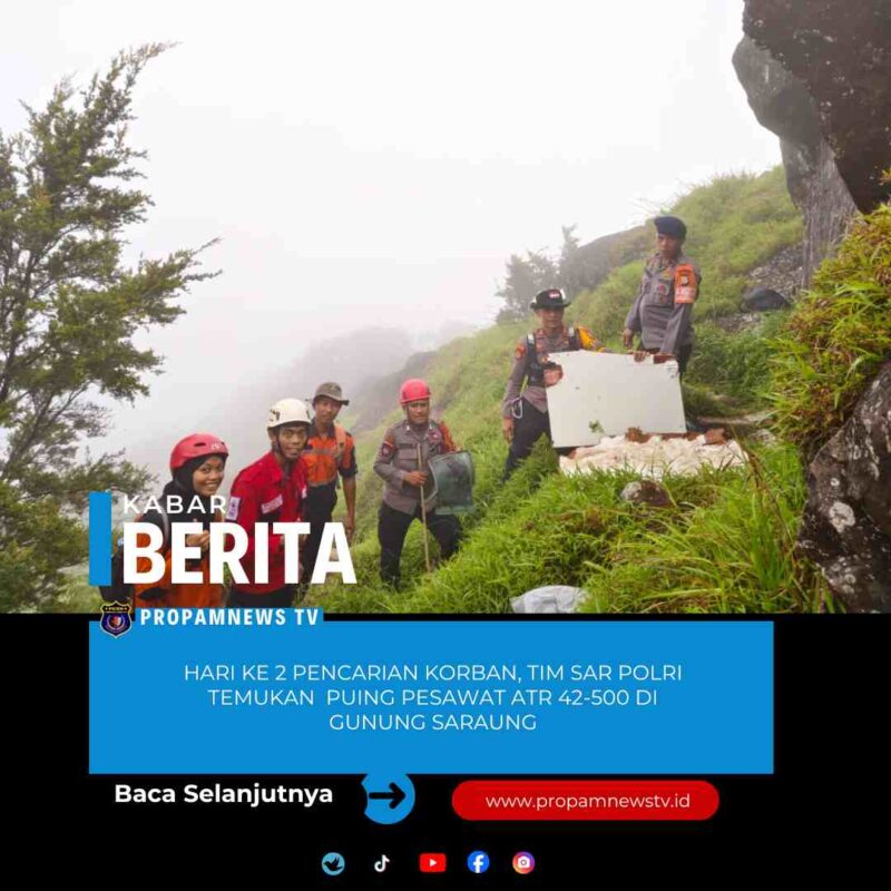 Pangkep //propamnewstv.id – Upaya pencarian hari kedua terhadap pesawat jenis ATR 42-500 milik Indonesia Air Transport yang hilang kontak di wilayah Sulawesi Selatan membuahkan titik terang. Tim SAR Gabungan dari Ditsamapta Polda Sulsel berhasil menemukan puing-puing pesawat di kawasan Gunung Bulusaraung, Kecamatan Balocci, Kabupaten Pangkep, pada Minggu (18/1/2026).