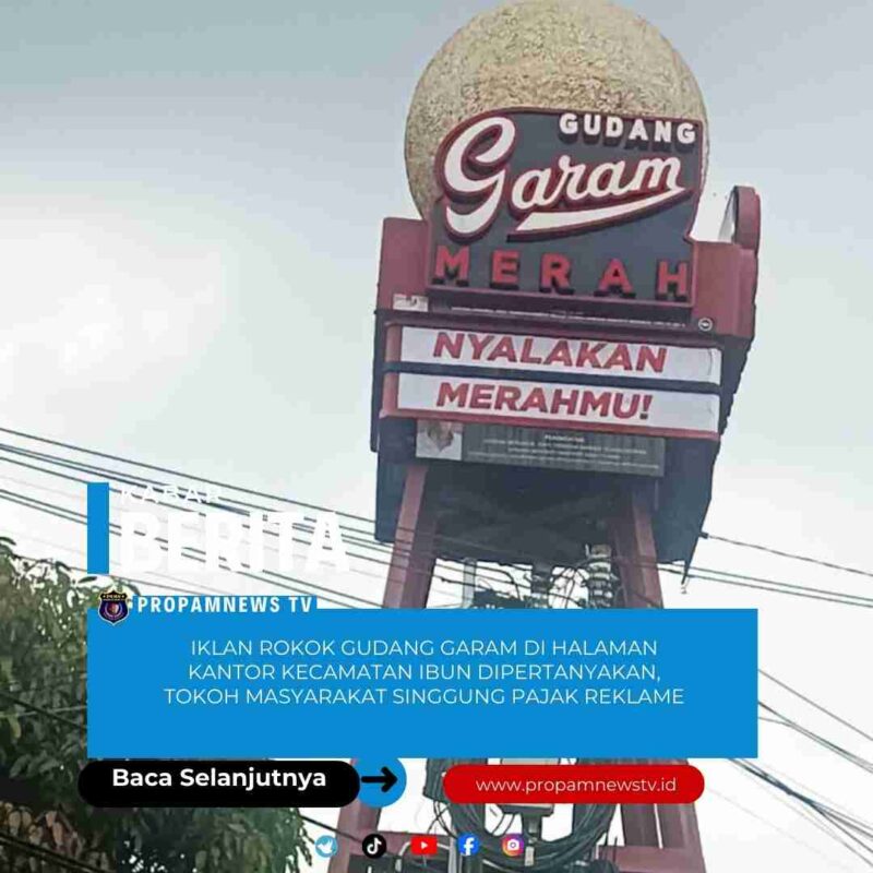Kab. Bandung, // PropamNewstv.id – Keberadaan iklan rokok merek Gudang Garam yang terpasang di halaman Kantor Kecamatan Ibun, Kabupaten Bandung, kembali menuai sorotan publik. Masyarakat mempertanyakan legalitas pemasangan serta kejelasan pembayaran pajak reklame dari iklan tersebut.
