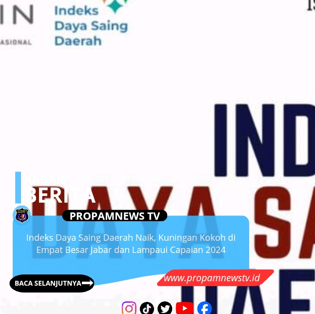 KUNINGAN, // PropamNewstv.id – Kinerja daya saing Kabupaten Kuningan kembali menunjukkan tren positif. Setelah pada IDSD 2024 meraih skor 3,82 dan menempati peringkat ke-14 nasional dari 416 kabupaten di Indonesia, pada rilis terbaru Indeks Daya Saing Daerah (IDSD) 2025 Kabupaten Kuningan mencatatkan peningkatan skor menjadi 3,88 .